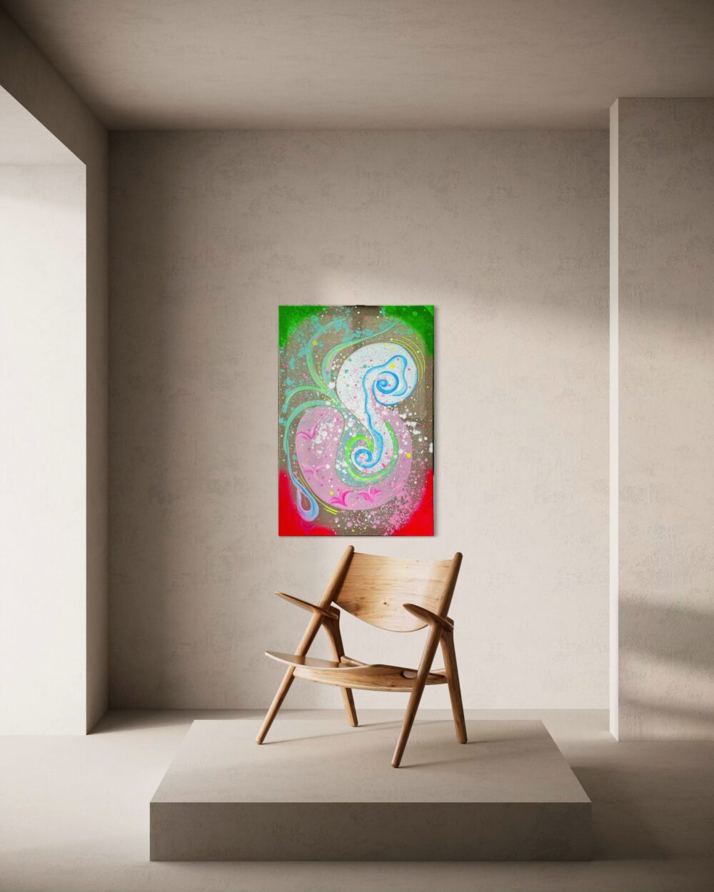 Ein abstraktes Spiel aus fließenden Linien, Spiralen und Farbspritzern. „Drops of Nature“ verbindet Wasser, Pflanzen und Blüten in einer lebendigen, dynamischen Bildsprache. Frische Farben und organische Formen lassen die Kraft und Leichtigkeit der Natur spürbar werden.