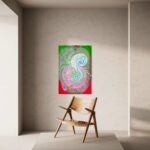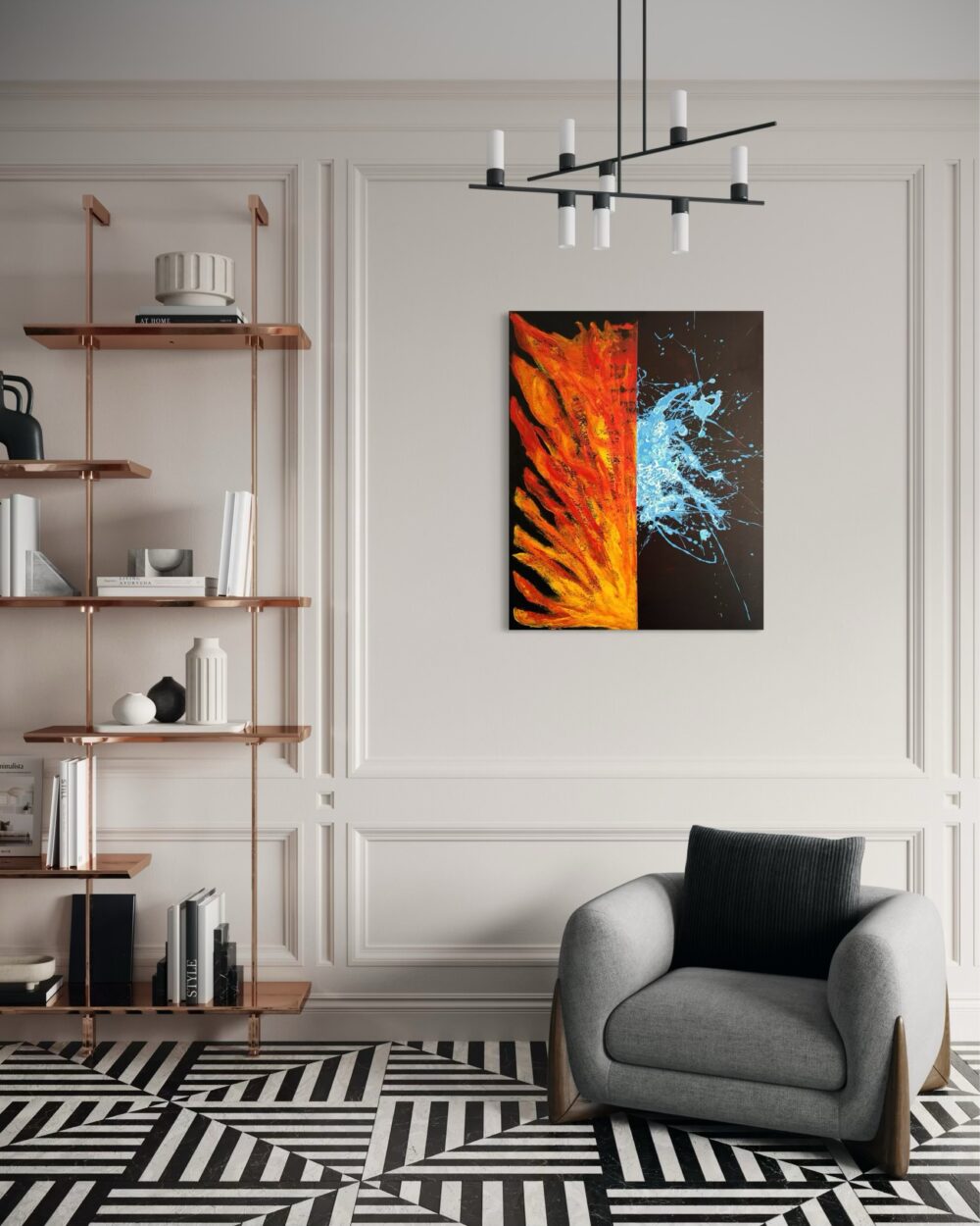Gemalt in Acryl auf Leinwand (80 x 100 cm), mit einem eigens gefertigten Holz-Stück als Werkzeug und in Kombination mit Drip-Technik, vereint das Werk Struktur und Dynamik. Es zeigt nicht nur Feuer und Wasser, sondern die ewige Suche nach Balance zwischen Energie und Ruhe, Hitze und Kühle, Chaos und Harmonie.